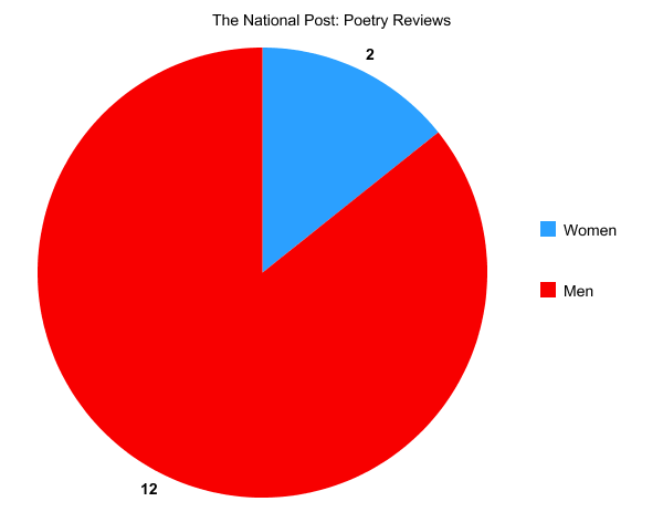 Only 2 of the 14 books of poetry that the National Post has reviewed in the last year and a half were written by women.   2 in 14. I was expecting some discrepancy, from what I had just passively noticed, but nothing like this.